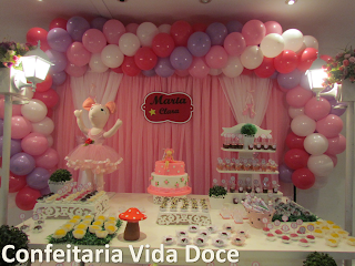 Para o aniversário da Maria Clara, a mamãe Alexandra escolheu o tema da Angelina Baillerina e suas amigas. Essa mesa foi montada no Buffet Funny Days, em Moema, e ficou muito graciosa.